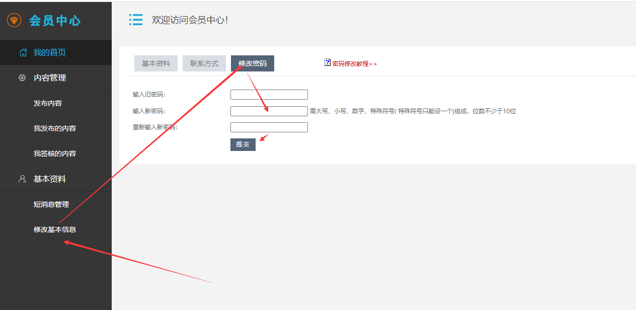 打開統一登陸地址-----點擊進入各自會員中心------點擊修改基本信息-------點擊修改密碼------輸入舊密碼和新密碼